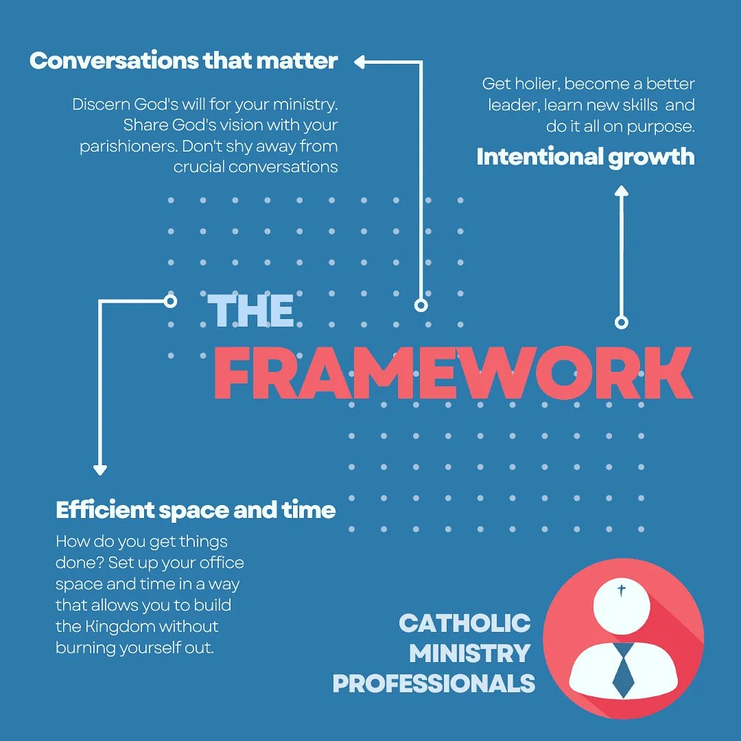 This was my experience when I first began working in professional Catholic ministry. So I decided to get very intentional with my conversations, my work space and time, and my own professional growth. I found that when I did focus on these three things, my ministry became more enjoyable and produced tangible fruit. These are the pillars of the Catholic Ministry Professionals framework.